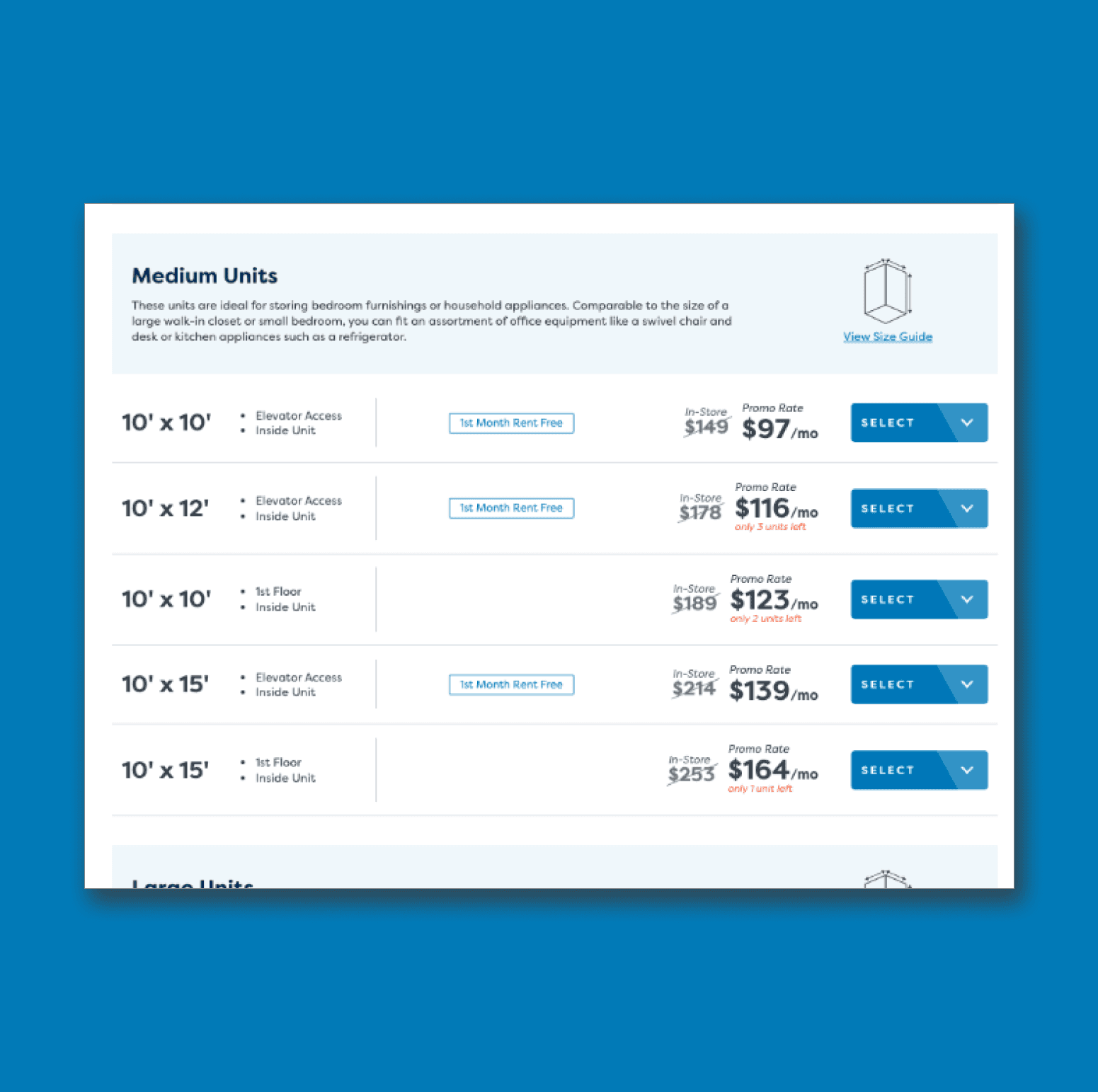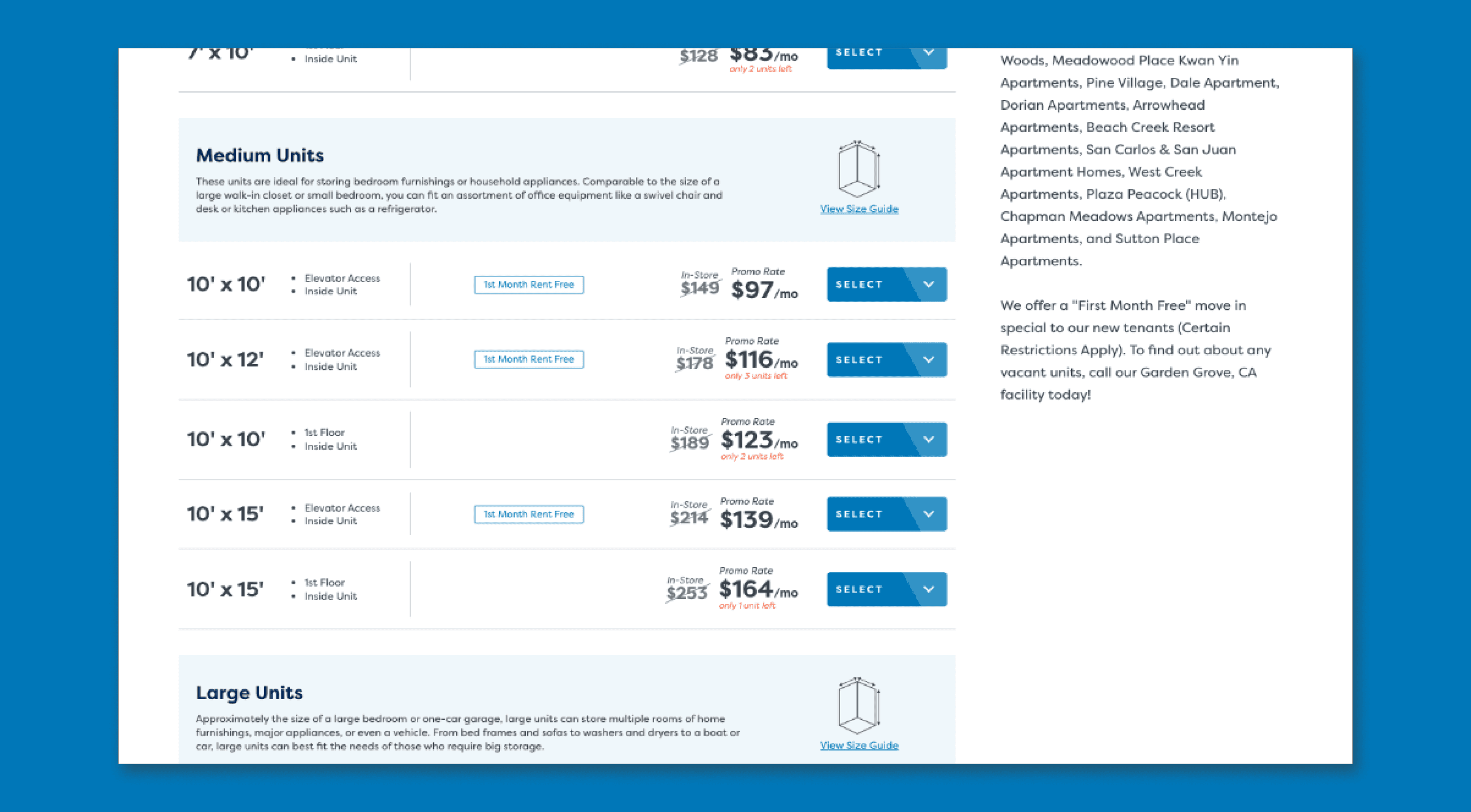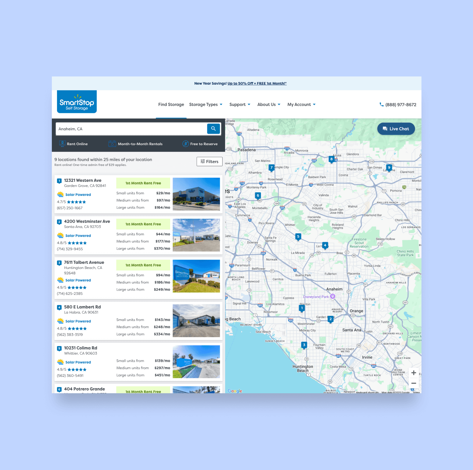 Find Storage Page: Redesigned facility cards to prominently display pricing, unit sizes, and features. Added list and map views for easier navigation.